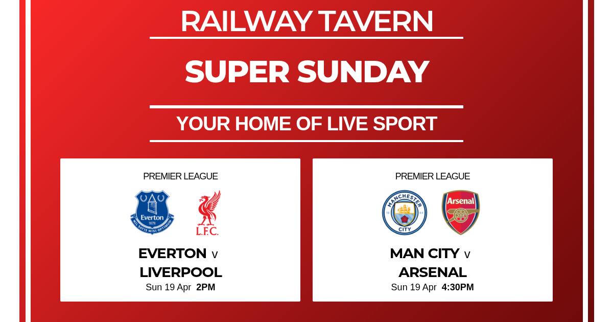 ⚽Super Sunday live at The Railway Tavern⚽ 🔵Man City vs Arsenal🔴⚪ The biggest game of the season is here! It's first vs second, Arteta vs Pep, Red vs Blue Arsenal have been poor over recent weeks but will be boosted with confidence after securing another champions league semi-final on Wednesday City are the inform team but have had mixed form all season 🔵Everton vs Liverpool🔴 Super Sunday kick's off with the Merseyside derby as Everton host Liverpool for the first time in their new home A win for the Toffee's would put them just two points behind their city rivals Whereas Liverpool need three points to move clear of the chasing pack for fifth place Who wins the derby? 🏠LIVE AT YOUR HOME OF SPORT